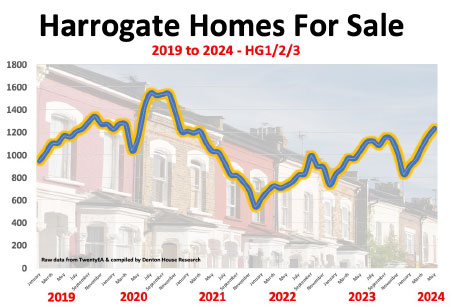 Thus, the number of UK net homes sales is lower, yet the number of homes for sale is much higher. Delving deeper into the Harrogate stats …