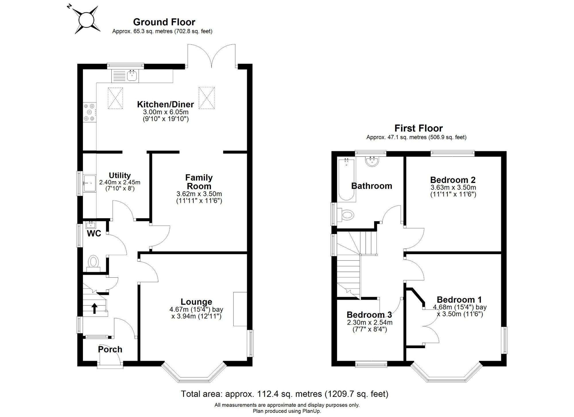 Upstairs, the first floor offers two generous double bedrooms, including one with an attractive bay window and fitted wardrobe, along with a third well-proportioned bedroom. These are served by a contemporary house bathroom featuring a shower over the bath, stylish white tiling, and fitted ceiling spotlights.