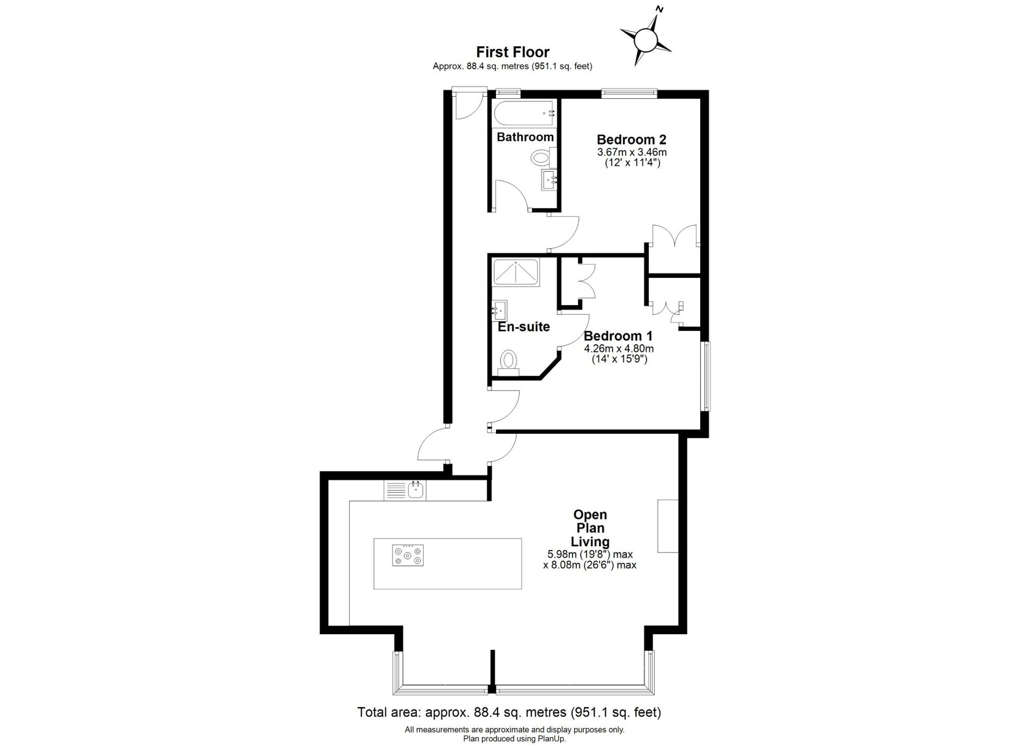 The apartment offers two well-proportioned double bedrooms, both benefiting from fitted wardrobes. The principal bedroom enjoys a modern en-suite shower room, while the second bedroom is served by a stylish contemporary house bathroom.