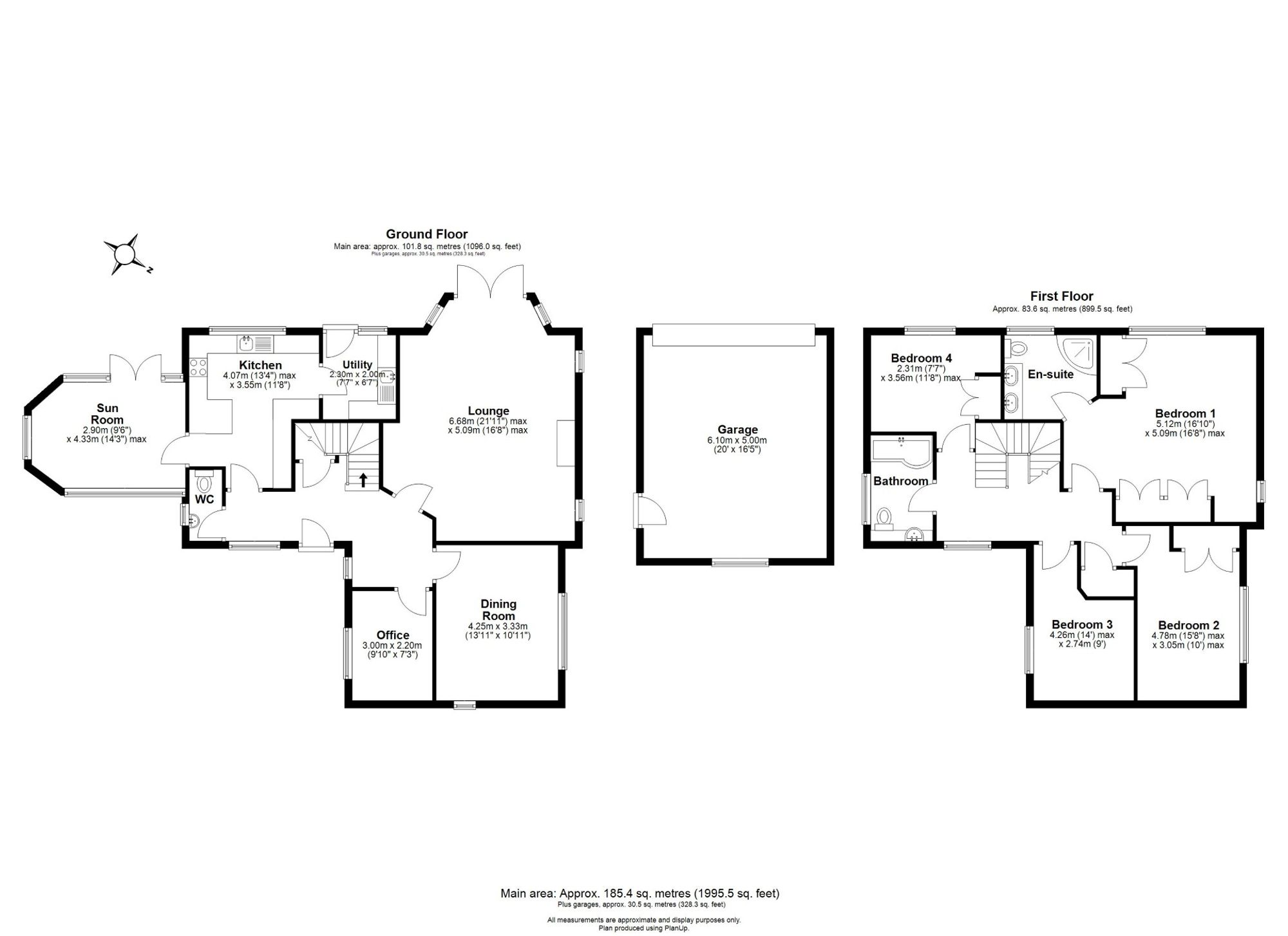 Upstairs, the property comprises four well-proportioned double bedrooms, three with fitted wardrobes. The principal bedroom enjoys particularly attractive rear views and benefits from a contemporary en-suite shower room with twin sinks. The remaining bedrooms are served by a modern family bathroom, complete with a bathtub and stylish spotlights.