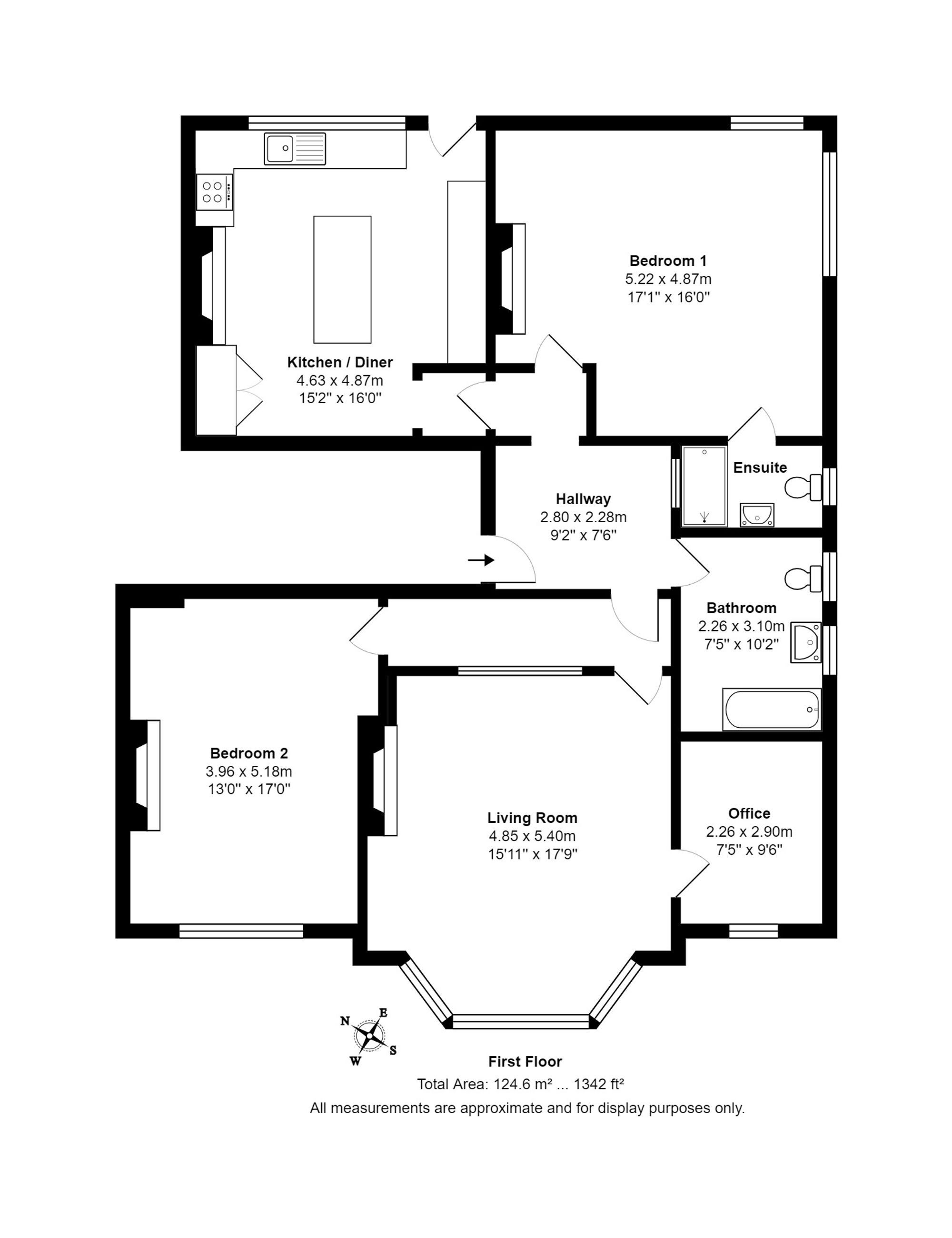 A communal hallway leads to the apartment, upon entering you are greeted with a spacious internal hallway leading to the impressive breakfast kitchen flooded with natural light from two large windows. The kitchen benefits from ample cupboard space, stone worktops and useful island with seating space. White goods provided include the oven, hob, fridge, freezer dishwasher and washing machine.