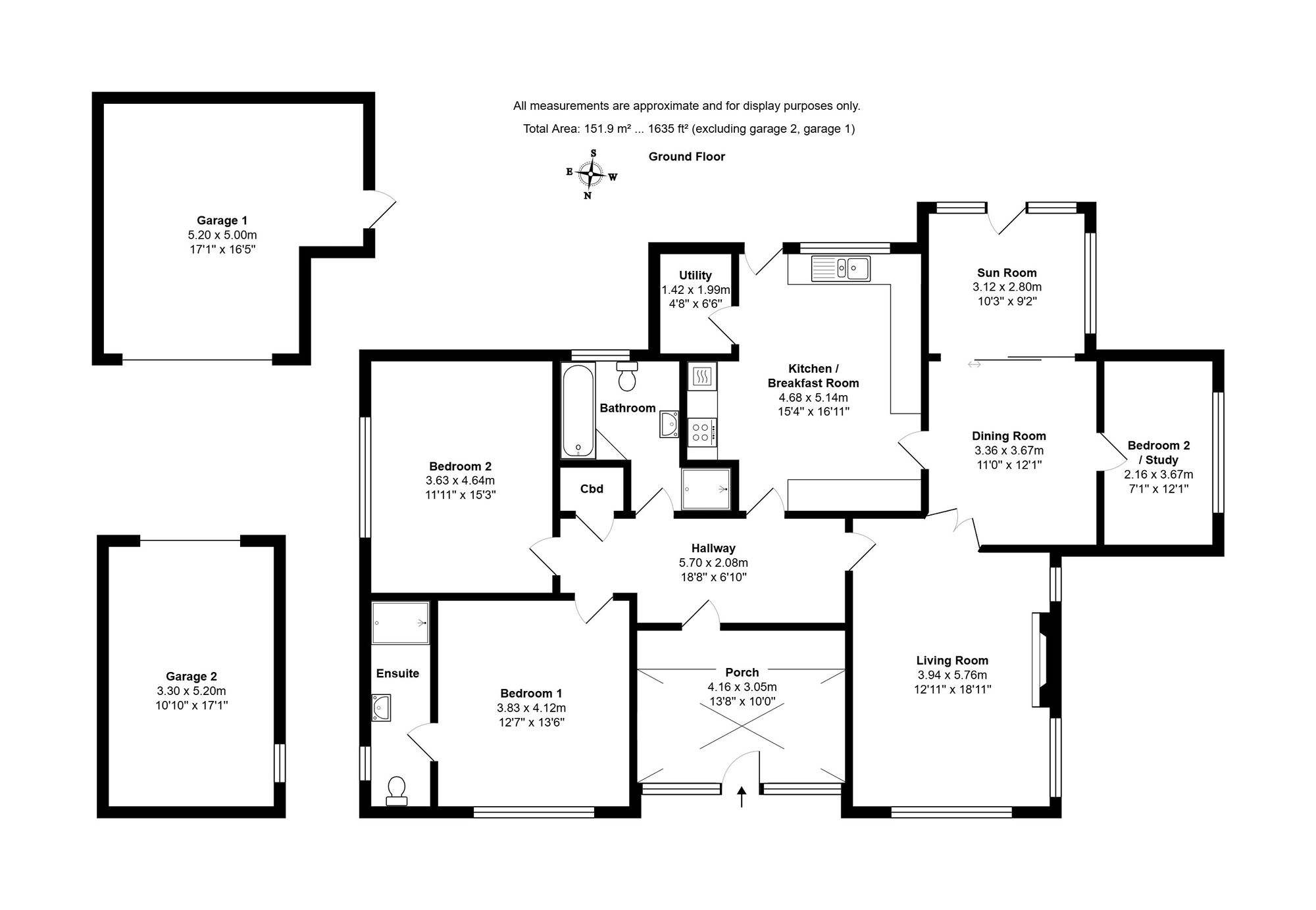 The bungalow features two well-sized bedrooms, including a principal bedroom with the benefit of an en-suite shower room. A modern family bathroom serves the remaining bedroom and guests. An additional room, currently arranged as a study/bedroom, provides excellent flexibility for home working, hobbies, or occasional guest accommodation.