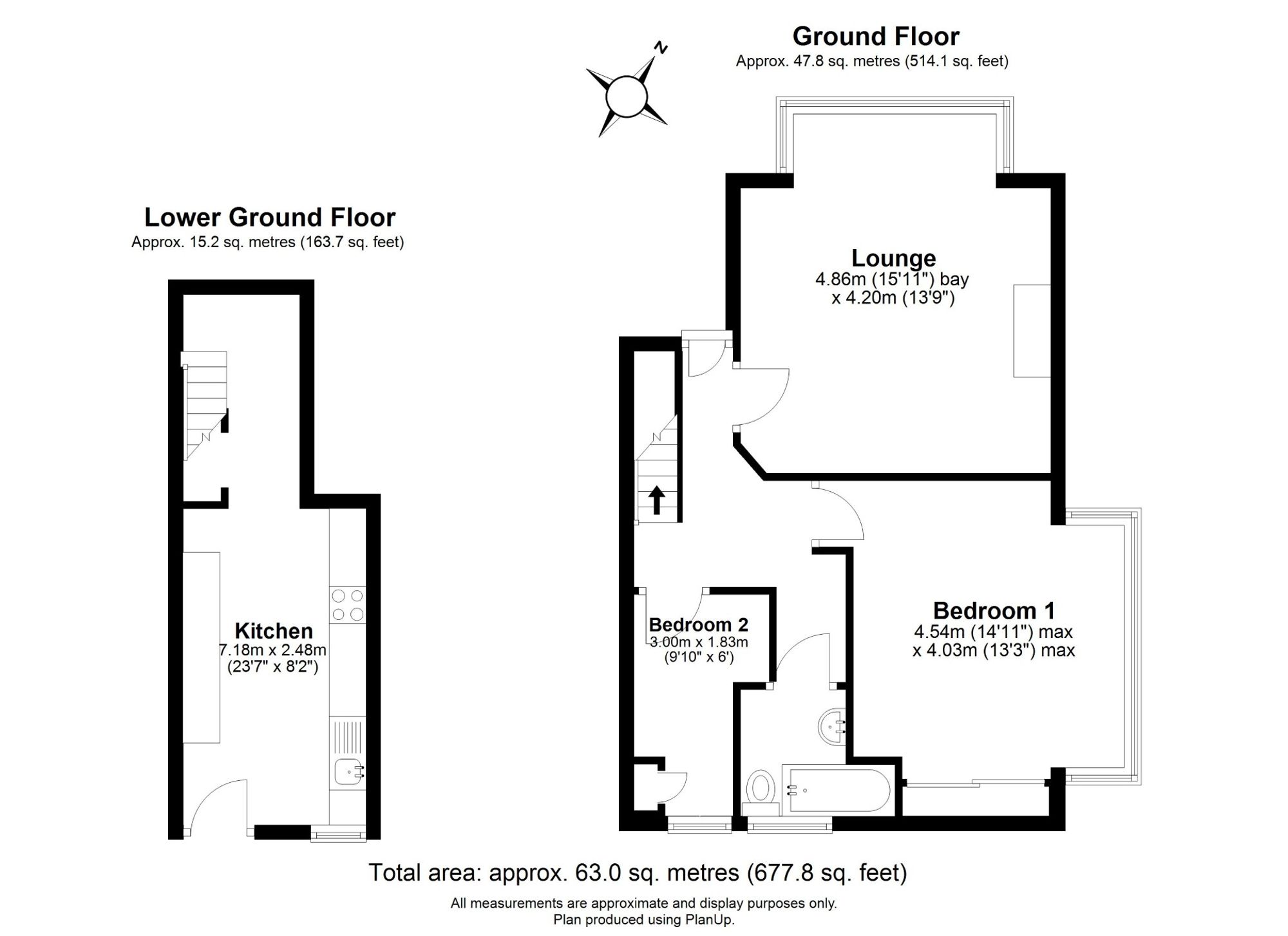 The apartment benefits from gas-fired central heating, double glazing, and charming period features including stripped internal doors. On the ground floor, a private reception hall leads to a bay-fronted sitting room with a feature fireplace and living flame gas fire, complemented by high ceiling cornicing and a picture rail. The principal bedroom includes fitted wardrobes, while a second bedroom, nursery, or study features a useful storage cupboard. A partially tiled bathroom with bath, shower over, and heated towel rail completes this level.