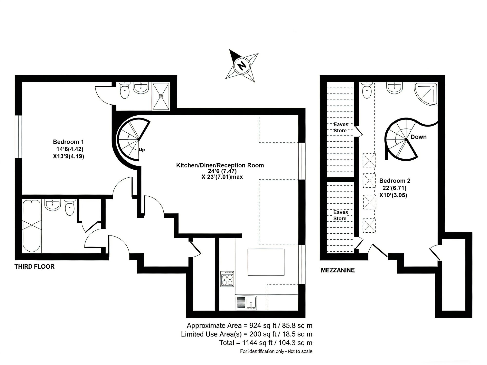 A charming winding staircase leads to the mezzanine floor, which overlooks the downstairs living space. The second bedroom occupies this level and benefits from a walk-in storage cupboard, multiple skylights and a partially exposed en-suite shower room, offering a unique and stylish layout.