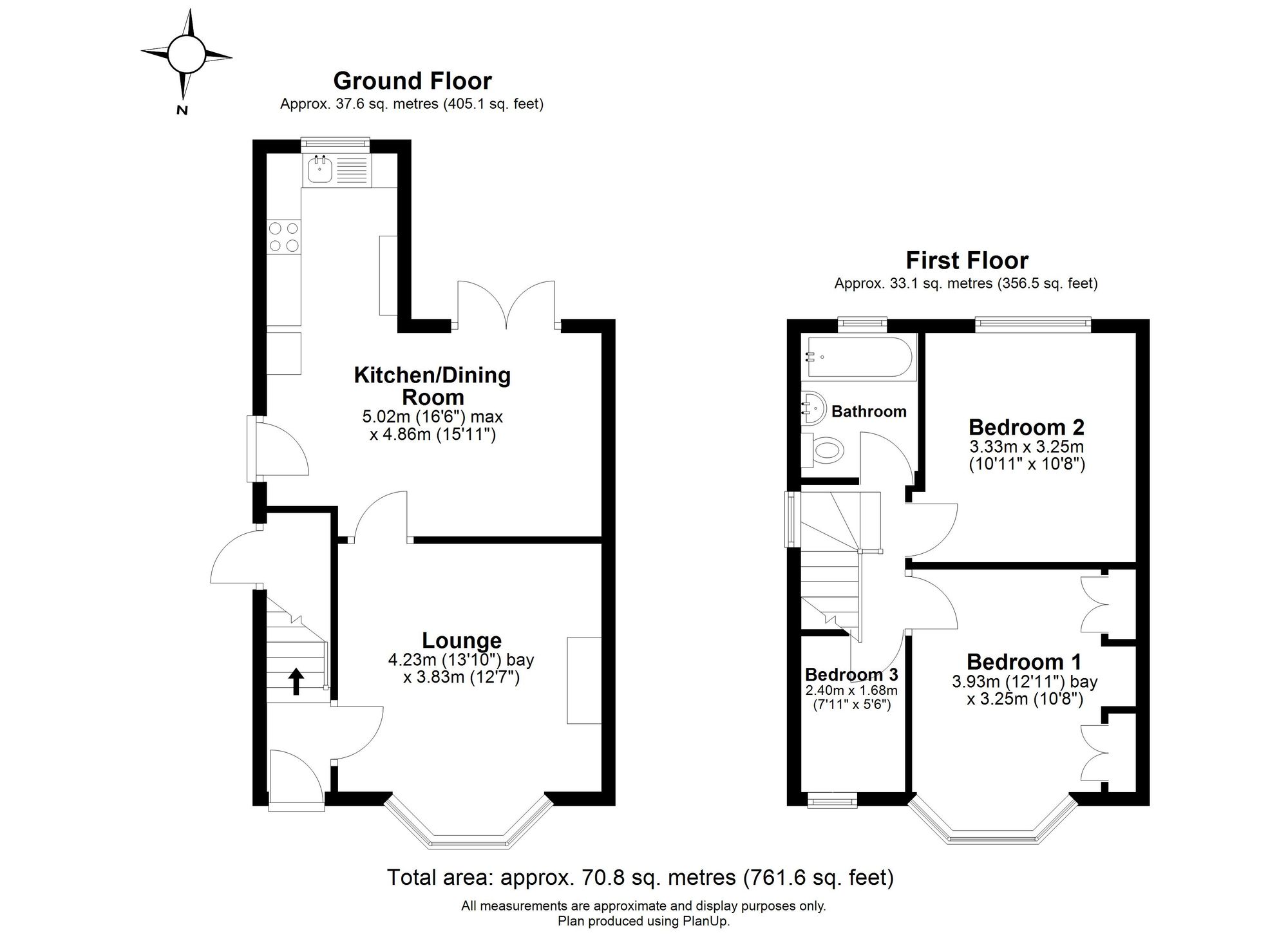 To the first floor, the principal bedroom enjoys a front-facing bay window and extensive fitted storage, while a second bright double bedroom is also positioned to the rear. These are served by a stylish contemporary family bathroom with over-bath shower and tasteful tiling. The accommodation is completed by a third single bedroom, currently utilised as a home office.